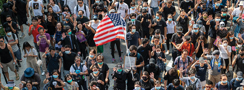 A Protester is seen holding up a US Flag in Hong Kong on September 8, 2019, Protester march from Charter Garden to the US Consulate in Hong Kong calling for support. (Photo by Vernon Yuen via Getty Images)
